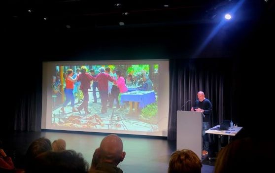 Die Aula des Leibniz-Montessori-Gymnasiums war gut besucht. Zum Gelingen der Veranstaltung trugen Schüler:innen und der Elternverein des Neugriechisch-Bilingualen Zweigs bei. Im Anschluss an die Filmvorführung konnten Zuschauer:innen Fragen an den anwesenden Regisseur Grigorios Nikoforidis und den Darsteller Dr. Efthymios Papachristos stellen, die aus Nürnberg angereist und sehr an der Reaktion des Publikums interessiert waren. Es entwickelte sich ein lebendiges Gespräch zum literarischen Begriff "Kofferkinder", in welches jeweilige biografische Perspektiven der eigenen Migrations-Geschichte einflossen. Aus erster Hand erfuhren die Zuschauer:innen nähere Details zu Idee und Konzept des Films, zu künstlerischen Mitteln und Motiven sowie zur Auswahl der Schauspieler:innen und zur Finanzierung. Der kommunikative und gesellige zweite Teil der Veranstaltung regte zum Nachdenken an und rundete die Filmveranstaltung ab.