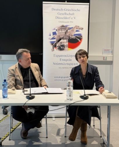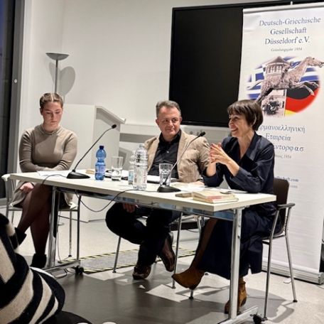 Zusammen mit Ioannis Kotoupas, Philologe am Leibniz-Montessori-Gymnasium und Mitglied der DGGD, und Schülerinnen seines Griechischkurses wurden ausgewählte Passagen in Griechisch und Deutsch vorgetragen. In einer interaktiven Diskussionsrunde mit dem Publikum wurden u.a. zentrale Motive in den Erzählungen erörtert und vertiefend betrachtet.